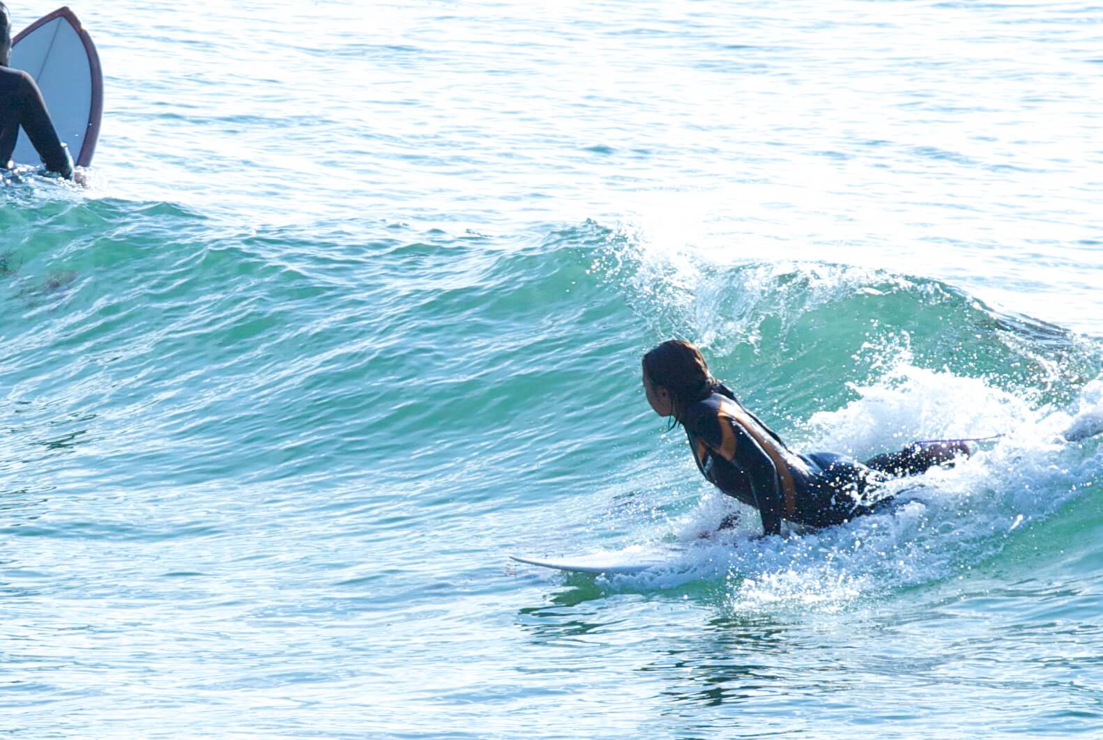 完璧なドルフィン(ダックダイブ)を習得しましょう!自分の経験上このドルフィンが出来るか出来ないかが良い波を掴める事が出来るか出来ないかの分かれ道のように感じます。しっかりノーズを沈めて(ここでもしっかり腕を伸ばして沈める)頭から深く潜るように意識しましょう。