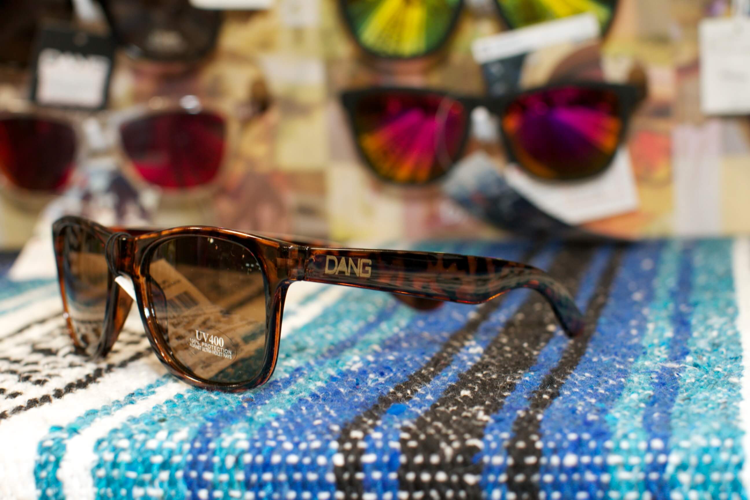 元々「Hang Loose(気楽にいこう)」というハワイのサーフ・カルチャーから始まったスラング(握りこぶしの親指と小指を立てて振るジェスチャー)をもじって、「Dang Loose Shades(めちゃくちゃゆるいカンジのサングラス)」と呼んでいたのを、Looseが抜けて「Dang Shades」(ダン・シェイディーズ)というブランド名に。