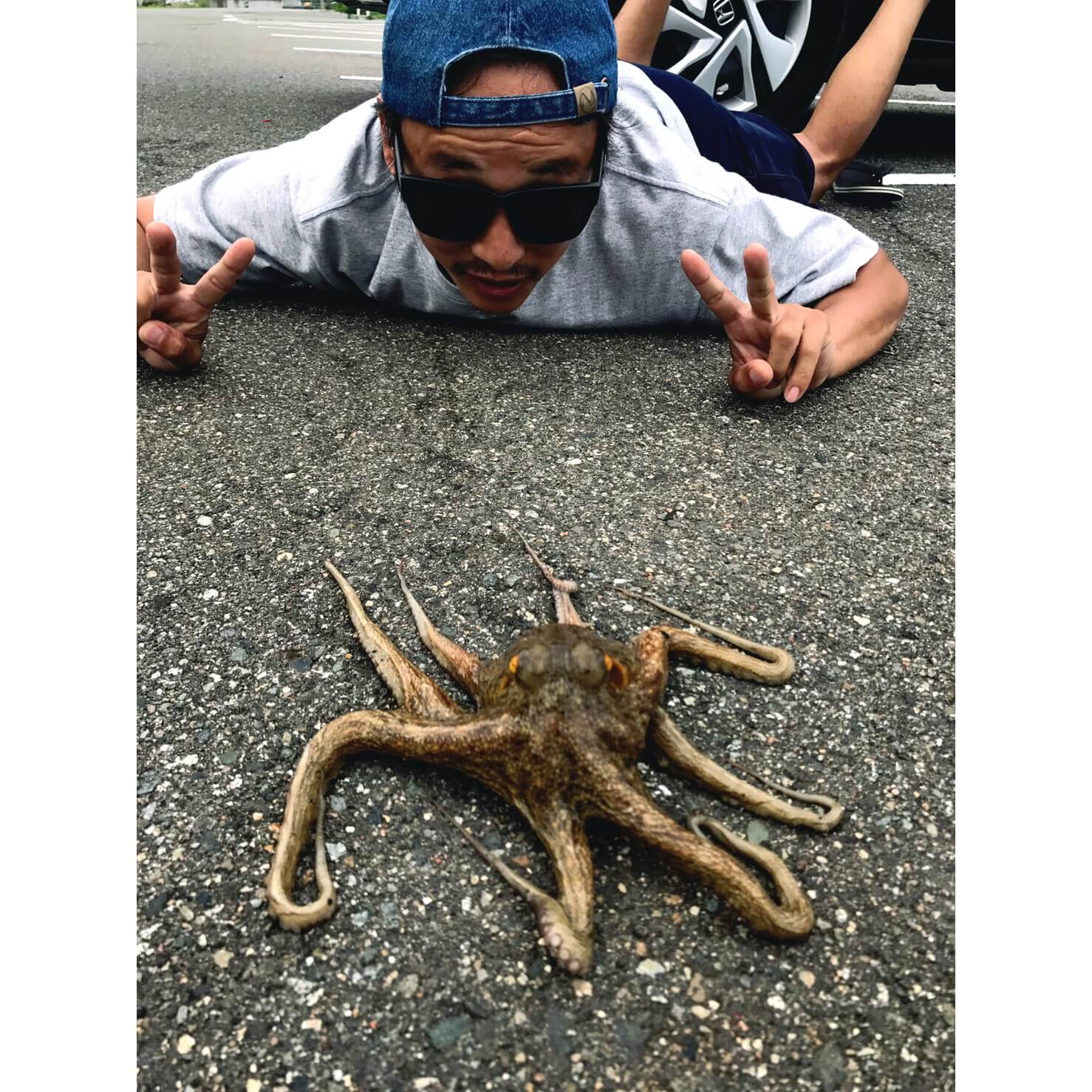 釣り名人云く「タコから釣られにやってきよる」と言いながら鋭い眼光で堤防を散策。この日は午前中から気温31度と厳しい・・・海に飛び込みたい気持ちをグッと我慢して付き合う事に・・・。